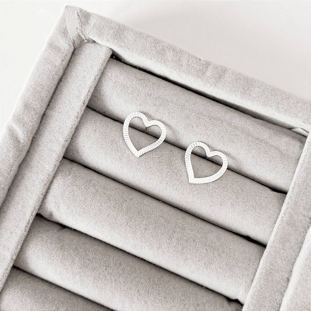 O Brinco Coração Vazado Riscado 14mm em Prata 925 é delicado, moderno e cheio de personalidade.