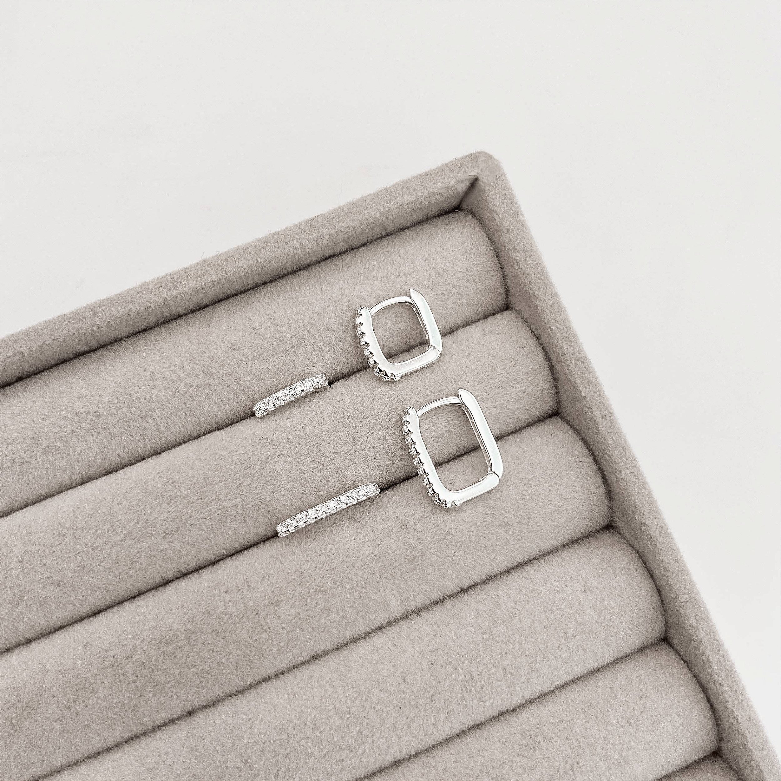 A Dupla de Argolas Click Retangulares Cravejadas em Prata 925 é perfeita para quem ama um look moderno, alinhado e com muito brilho.