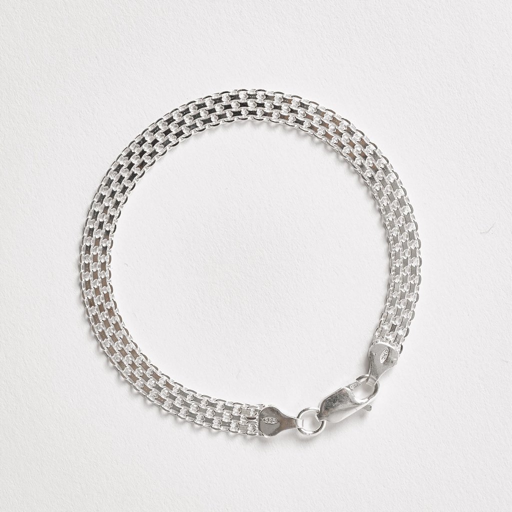 O modelo “esteira” combinado ao estilo cadeado cria uma peça moderna, estruturada e com brilho marcante — perfeita para quem quer uma pulseira robusta, mas com acabamento refinado.